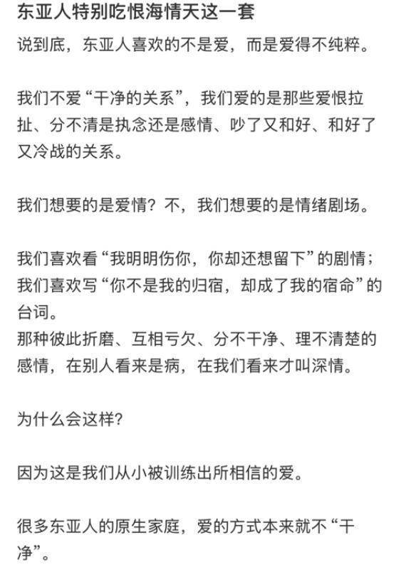 网上有个很火的讨论,为什么东亚人格外钟情于“恨海情天”这一套?一条高赞回答写道:因为那是我们从原生家庭学到的第一课。