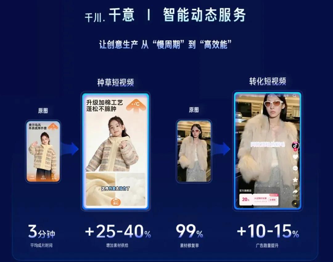 而千意的这些能力背后,则是抖音电商的两大优势:一是多模态大模型的技术积累,能保证素材的质量和风格一致性;二是海量的内容数据沉淀形成的知识库,能让千意精准把握抖音的内容趋势和用户偏好。